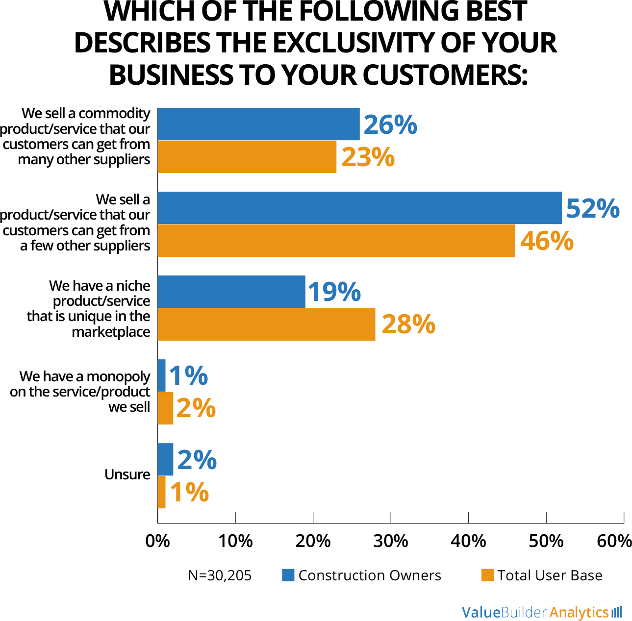 New analysis from Value Builder Analytics, based on more than 80,000 completed Value Builder Score Reports, shows just how crowded the field is. More than half of construction owners say their customers could easily replace them, 6 points higher than the broader market. And fewer than one in five describe their offering as truly unique, making construction owners about 30% less likely than those in other industries to see their businesses as differentiated.