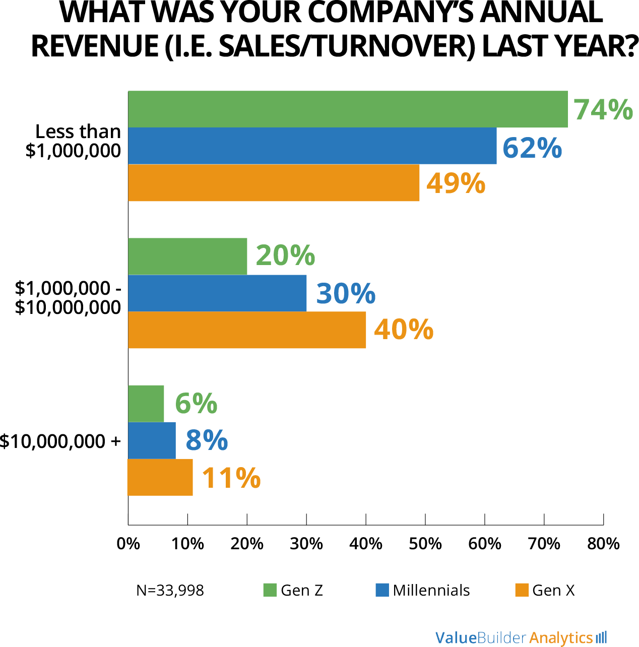 Drawing on more than 80,000 completed Value Builder Score Reports, our latest analysis shows that, while Gen Z and Millennial owners are more likely to be running businesses with less than $1 million in revenue, Gen Xers are operating at a different level. 40% of Gen X owners run businesses in the $1–$10 million range, and they’re almost twice as likely as Gen Z founders to be running companies worth over $10 million.